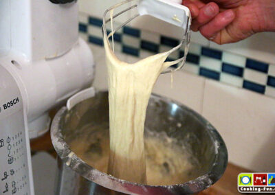 Die Zutaten in einer Schüssel miteinander verrühren, bis ein glatter Teig entsteht, der dann beginnt leichte Blasen zu schlagen. Der Teig sollte in der Konsistenz leicht zähflüssig sein. Beim Schaben vom Brett eher etwas flüssiger, beim Hobel etwas fester und beim pressen noch etwas fester. Hier hilft nur Erfahrung sammeln.