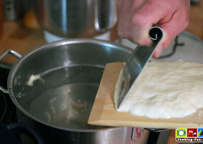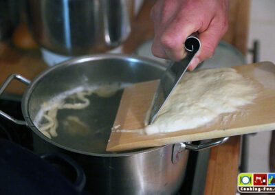 Nun kommt wie oben bereits erwähnt ein nicht zu großer Klecks Teig aufs Brett, wird flachgestrichen und dann streifenweise ins kochende Wasser geschabt. Beginnt erst mal mit 2-3 Streifen und schmeckt nochmal ab, jetzt könnte man noch nachsalzen und noch einmal durchkneten. Dann startet die Fleißarbeit. Zwischendurch im Wassertopf mal durchrühren, damit die Spätzle nicht zusammenkleben, das ist besonders dann ein Problem, wenn man eine Spätzlepresse verwendet.