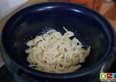 Wenn die Spätzle später weiterverwendet werden sollen und abkühlen müssen/dürfen, dann noch eine Schale mit Eiswasser zum Abschrecken bereitstellen. Das Abschrecken verhindert das Zusammenkleben und stoppt den Garprozess
