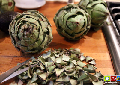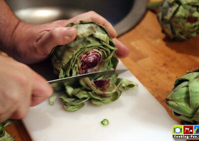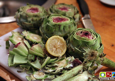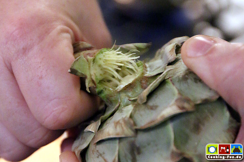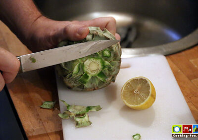 Die Vorbereitung am besten frisch vor der Zubereitung starten oder zwischendurch die bearbeiteten Artischocken in eine große Schale mit Zitronenwasser tauchen.