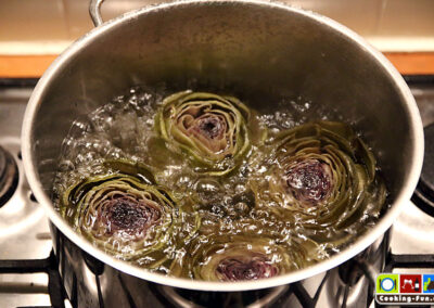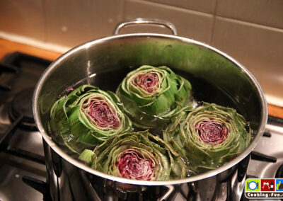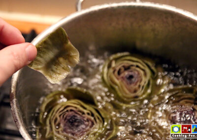 Die Artischocken kommen nun in einen großen Topf mit kochendem Salzwasser. Wichtig: Es muss wirklich schön salzig sein, denn der Geschmack geht in das Fruchtfleisch über.