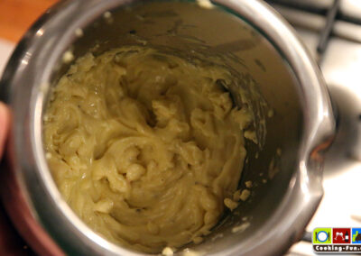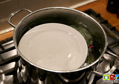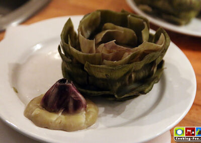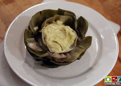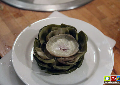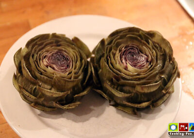 Noch einmal aufkochen und dann die Hitze etwas reduzieren, so dass es seicht köchelt. Wichtig: Die Artischocken mit einem Teller beschweren (also einfach drauflegen – muss natürlich in den Topf passen), so dass sie ganz im Wasser eingetaucht sind. Sie brauchen jetzt je nach Größe zwischen 30 und 45 Minuten. Die Artischocken sind fertig, wenn sich ein Blatt einfach, ohne großen Widerstand abziehen lässt. Ich hab sie gern etwas weicher. Wenn sie aber auseinanderfallen, waren sie zu lange drin. Die Kochzeit ist bestens geeignet, den Dip anzusetzen. Ich mag dazu am liebsten eine mit frischem Knoblauch zubereitete Aioli (vgl. Aioli Rezept).