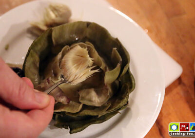 Mit einem kleinen Löffel kann bereits jetzt das sogenannte Heu, das noch eine ungenießbare Hürde vor dem Erreichen des Bodens ist, herausgelöffelt werden. Wenn die Artischocke weich genug ist, kann man mit leichtem Druck vom Rand des Heus in Richtung Mitte die komplette Heuschicht lösen und entfernen. Nun noch die äußeren Blätter wieder zurück in Form bringen.