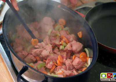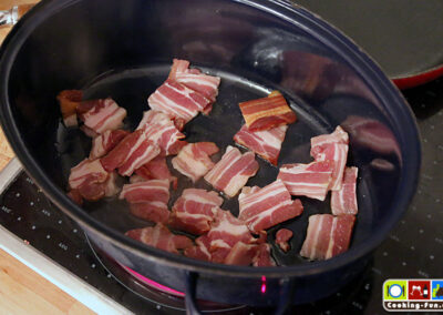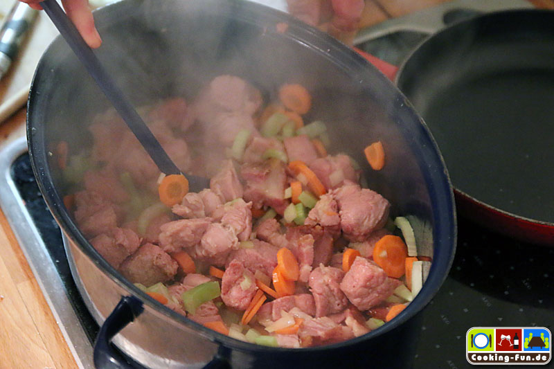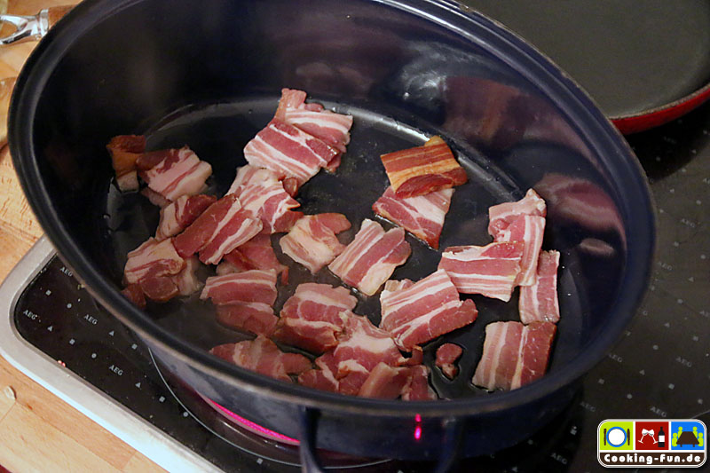 Es beginnt mit der Schnippelarbeit: Zwiebel schälen und fein würfeln, Karotten schälen und in Scheiben schneiden, Sellerie putzen, also Faser-Fäden entfernen und auch in Scheiben schneiden, Speck von der Rinde befreien und in Scheiben schneiden und auch das Fleisch wird in gleichgroße Würfel mit etwa 3cm Kantenlänge geschnitten.
