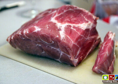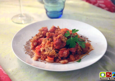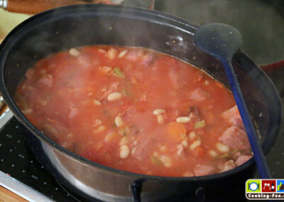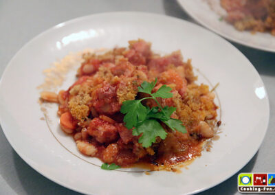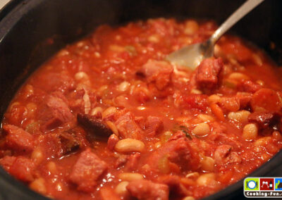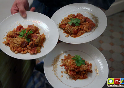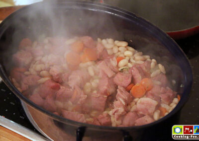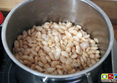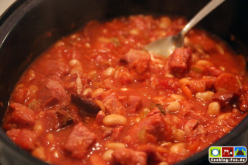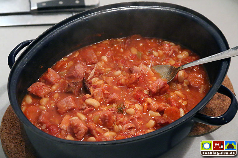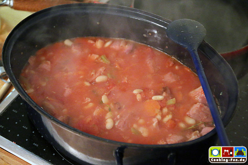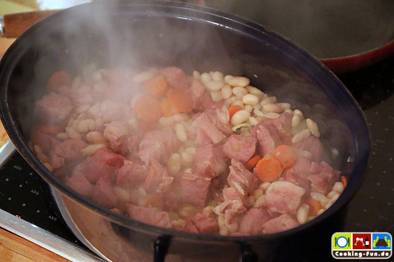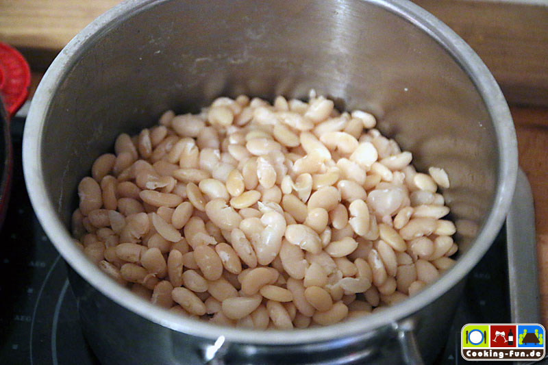 Wir haben getrocknete weiße Bohnen benutzt, die müssen 1 Tag vorher über Nacht eingeweicht werden. Dann müssen sie (laut Packungsangabe) fast eine Stunde gekocht werden. Da sie später noch weiter garen, haben wir sie nicht ganz durchgekocht, sondern bereits nach 45 Minuten abgegossen. Schneller geht es mit sofort verwendbaren Dosenbohnen. Ich bilde mir aber immer wieder ein, dass die getrockneten besser schmecken.
