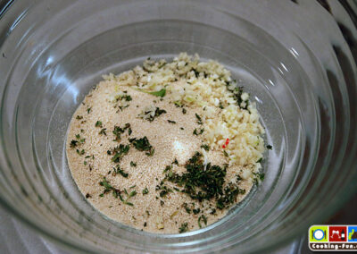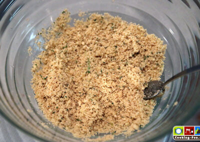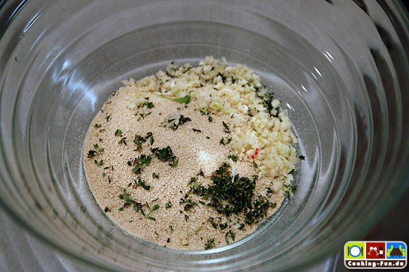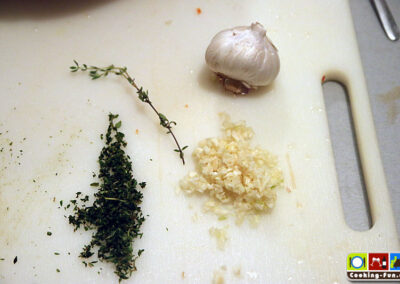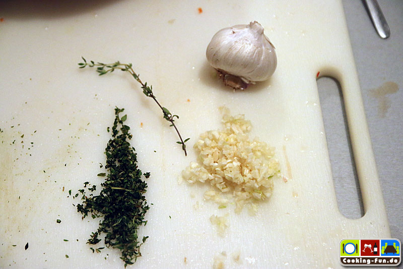 Nebenbei kann man das Topping zubereiten: Knoblauch und Thymian werden fein gehackt und mit weicher Butter sowie Semmelbröseln vermengt.
