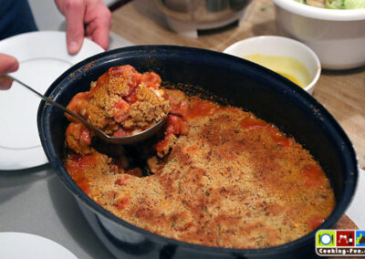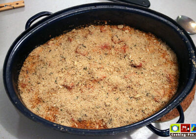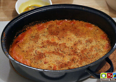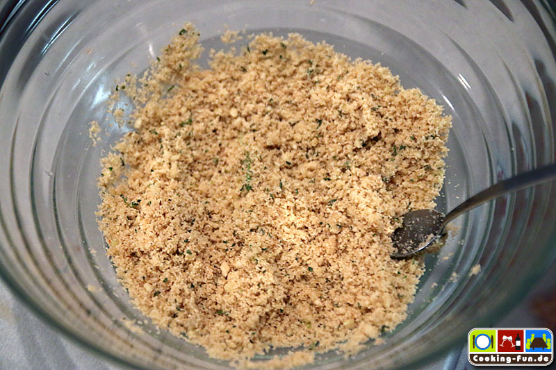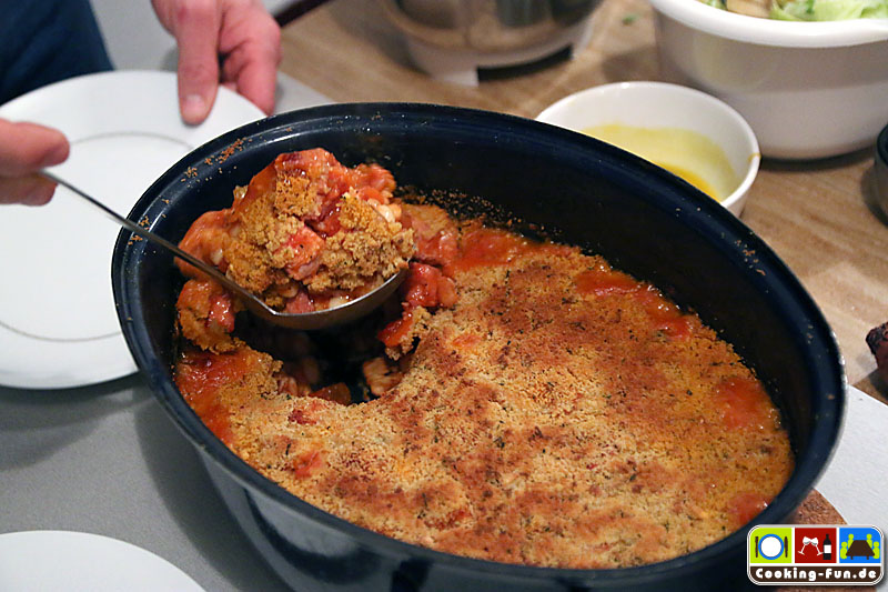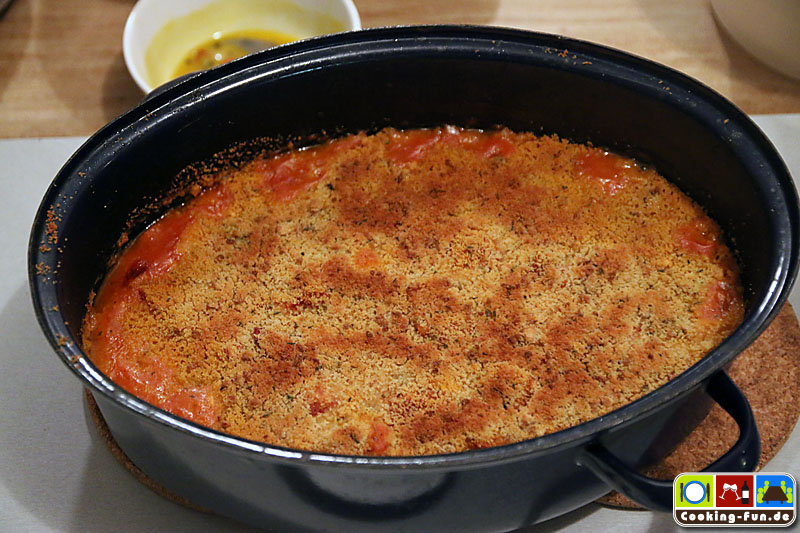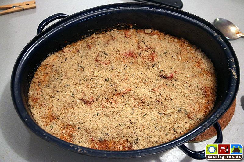 Nach der Garzeit den Bräter kurz aus dem Ofen nehmen, abschmecken und dann oben mit den Bröseln flächig bestreuen (sollen nicht einsinken) und noch mal für ca. 10 Minuten bei Oberhitze in den Ofen, ggf. auch kurz den Grill zuschalten. Es soll eine leicht gebräunte, goldgelbe Kruste entstehen.