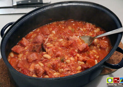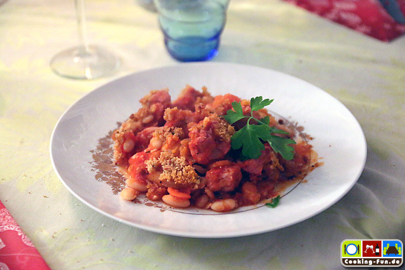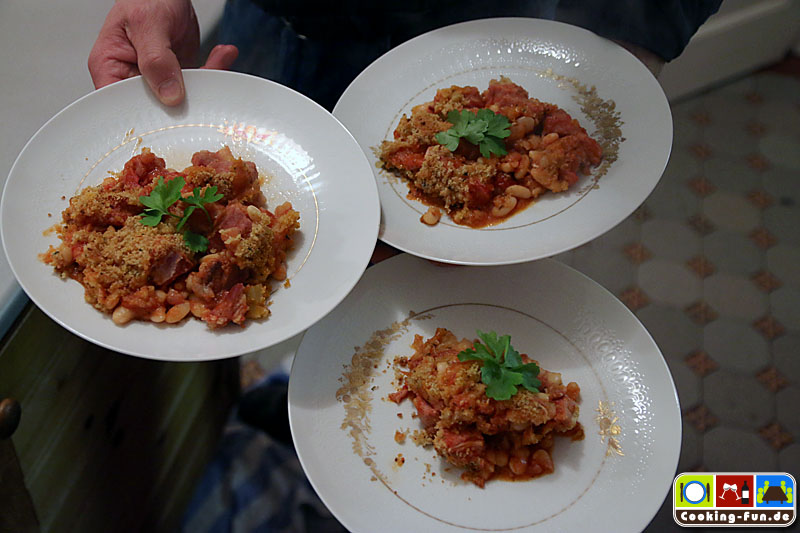 Okay, dieses Rezept hier ist eine schnelle aber verdammt leckere Variante des südfranzösischen (Region Languedoc) Klassikers. Im Original finden sich neben weißen Bohnen und Schweinefleisch auch Hammel- und Gänsefleisch sowie spezielle Würstchen. Eigentlich wird mit einem offenen Topf über Stunden gebacken, die dabei entstehende Kruste rührt man unter. Traditionsgemäß soll dies sechsmal geschehen, so dass das Gericht letztlich sieben Krusten hat. Der Name ist eine Ableitung vom Wort für die zur Zubereitung verwendete irdene Keramikform „Cassole“.