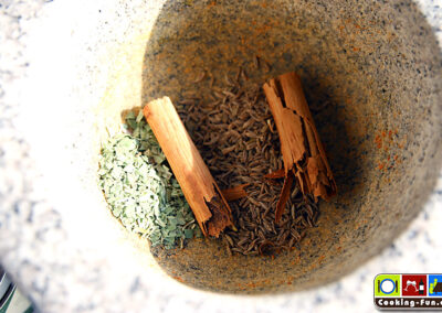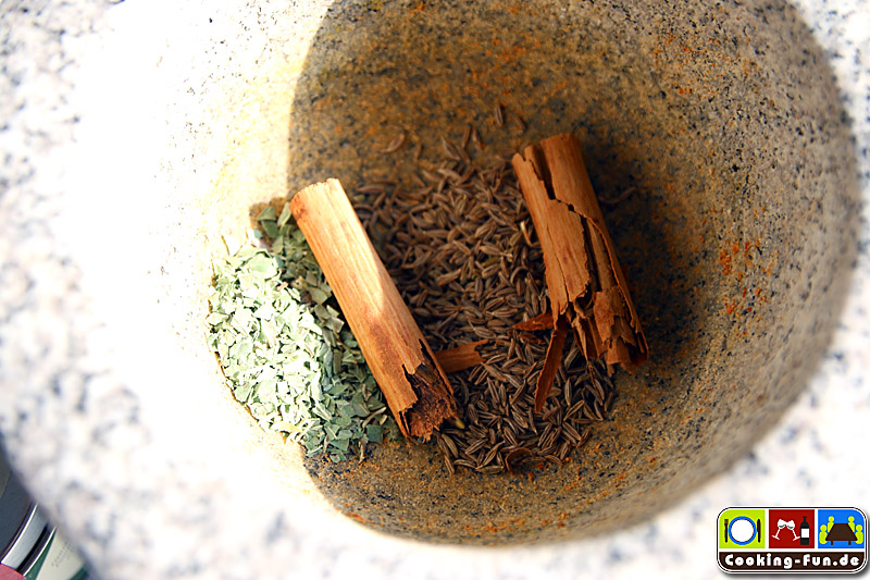 Zimt, Kreuzkümmel, Piment und Oregano im Mörser mit dem Stößel zermahlen, Paprikapulver zugeben.