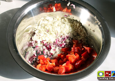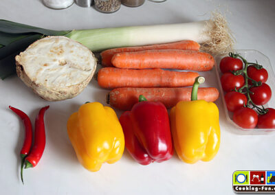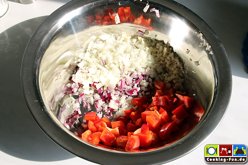 Paprika, Zwiebeln, Knoblauch, Chilischoten putzen, ggf. schälen und kleinschneiden.