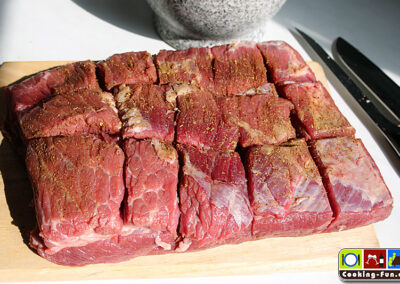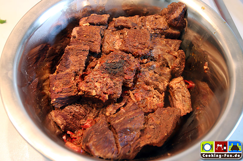 Ich beginne mit dem Fleisch. Ohne die weitere Chili Zubereitung kann man es auch pur, mit Brot, im Tortilla mit Guacamole und Joghurt etc. servieren. Aus diesem Grund habe ich das Rezept auch in zwei Teile gegliedert.
