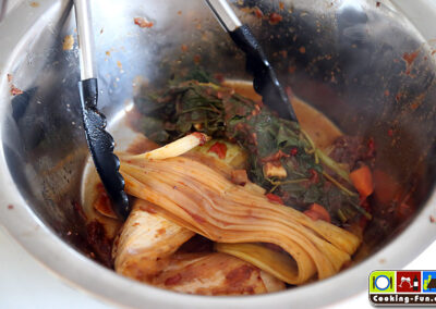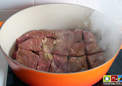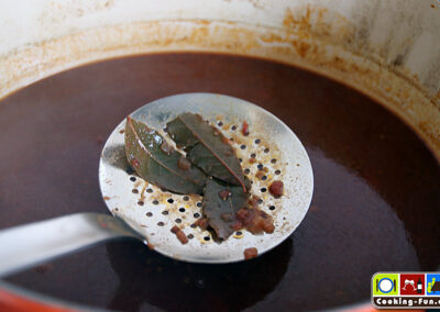 Die gemörserten Gewürze in die im Fleisch entstandenen Einschnitte einmassieren. In einem großen Bräter etwas Öl erhitzen und das Fleisch bei hoher Temperatur scharf anbraten, es soll etwas Farbe bekommen. Das Fleisch dann aus dem Bräter nehmen und kurz beiseitelegen.