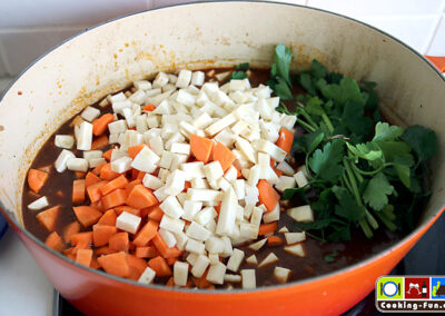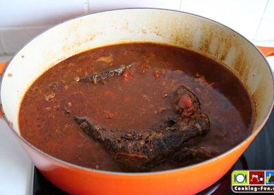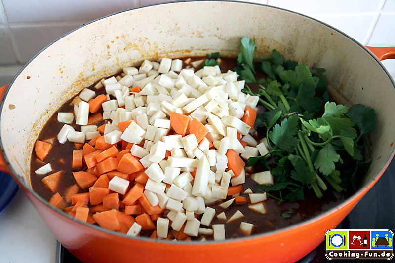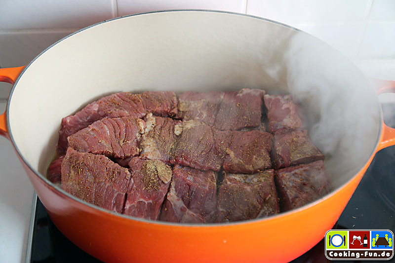Für etwa 4-5 Stunden kommt der Deckel auf den Bräter und man lässt es einfach leicht vor sich hin simmern (nicht sprudelnd kochen). Ja, es braucht wirklich so lange.