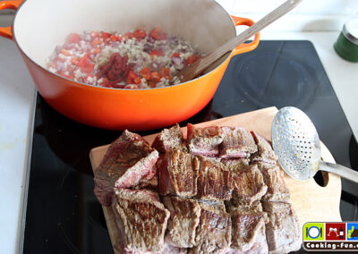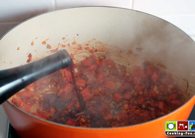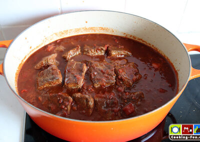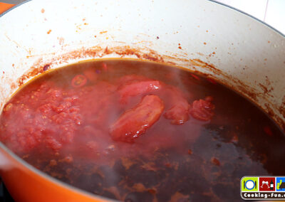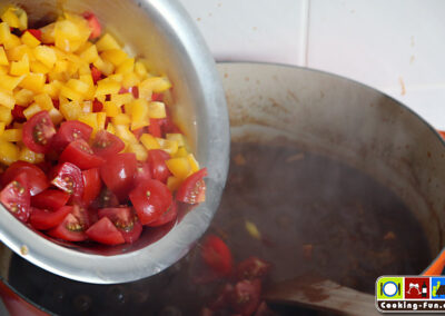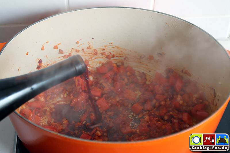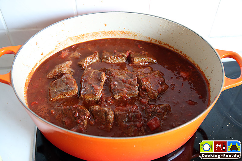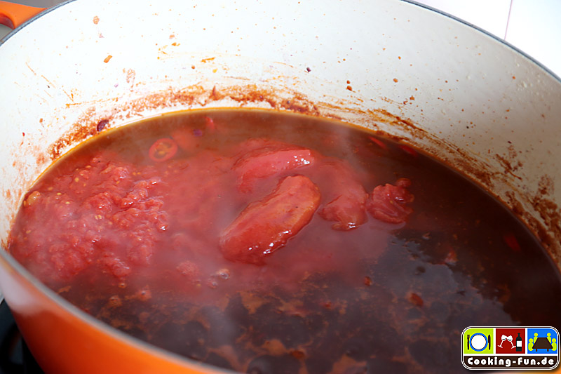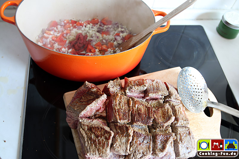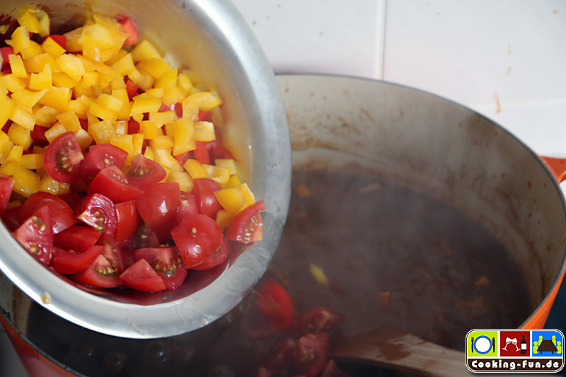 Im gleichen Bräter, im gleichen Fett nun Chilis, Zwiebeln, Paprikawürfel und Knoblauch anbraten und etwa 5 Minuten Farbe (goldgelb, nicht schwarz) nehmen lassen. Das Tomatenmark unterrühren und 2 weitere Minuten anschwitzen. Danach mit dem Wein ablöschen und den Bodensatz lösen. Der Wein muss nun richtig reduziert werden, bis nur noch eine cremige Masse mit ganz wenig Flüssigkeit übrig ist. Erst dann Rinderbrühe und Tomaten zugeben, alles noch einmal aufkochen, Lorbeerblätter zugeben und das Fleisch zugeben.