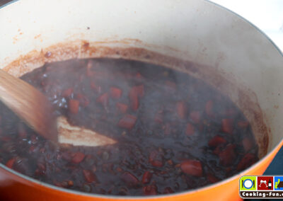 Wenn Ihr mit getrockneten Bohnen arbeitet, schaut auf die Packung. Ich weiche sie über Nacht in kaltem Wasser ein. Sie müssen dann aber noch zwischen 1 und 2 Stunden gargekocht werden. Das heißt, an dieser Stelle folgt noch mal ein längerer Kochprozess.