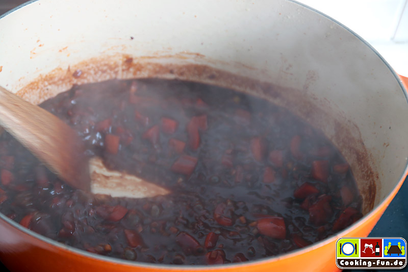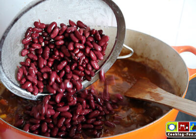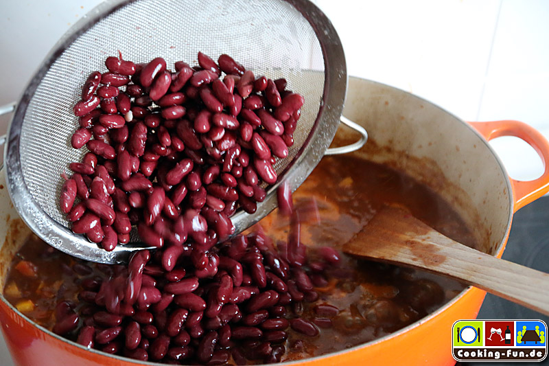 Ganz einfach, die, die Du am liebsten magst. Rezepte sind immer nur Ideengeber und müssen individuell adaptiert werden. Es ist jedem selbst überlassen, welche Bohnen er verwendet und was die Vorratskammer hergibt. Hier hab ich mit Kidneybohnen aus der Dose gearbeitet. Ich hab auch schon mal mit einer Kombination aus über Nacht eingeweichten Wachtel- und Kidneybohnen dieses Chili gemacht, war auch klasse, da die Wachtelbohnen Biss behalten. (Nachtrag: nehmt größtenteils getrocknete Bohnen, der Biss ist klasse.) Ich habe auf den ersten Fotos ein paar dicke Bohnen, die noch übrig waren, mit verkocht. Gut machen sich auch Baked Beans, die bringen sogar noch etwas Tomatensoße mit. Wer mag, kann auch Kichererbsen zugeben, die finde ich jedoch unpassend. Mais ist für mich im Chili ein echtes No-Go geworden.