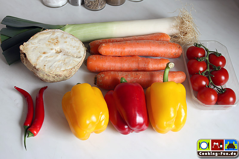 Während der Suppengemüse-Kochzeit die Paprika sowie die frischen Tomaten putzen und in gefällige Stücke schneiden sowie die Kidneybohnen in einem Sieb abspülen. Alles bereitstellen aber noch nicht zugeben.