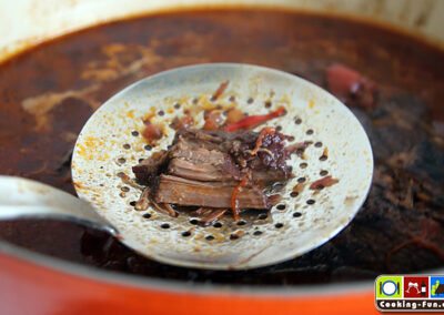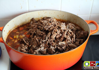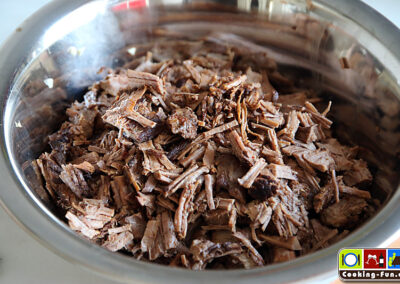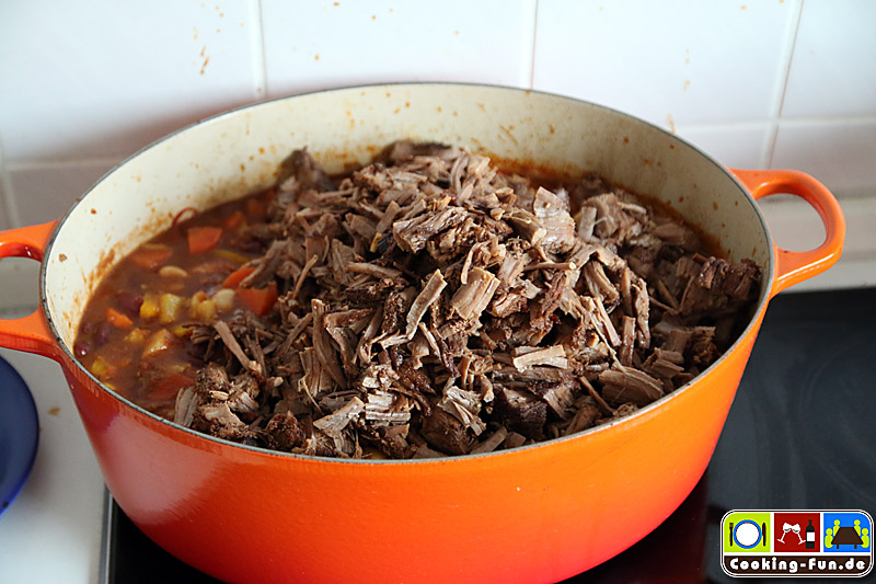 Das Fleisch aus dem Sud heben, es sollte jetzt schon beim Anschauen zerfallen. Etwas abkühlen lassen und mit den Fingern (oder aber mit zwei Gabeln) zerzupfen. Damit die Stücke nicht so unpraktisch lang werden, vorher quer zur Faser mit einem scharfen Messer zerteilen. Die Stücke dann mit den Fingern grob auseinanderfasern und dabei die weichgekochten Fettreste abstreifen, die wollen wir nicht im Chili haben.