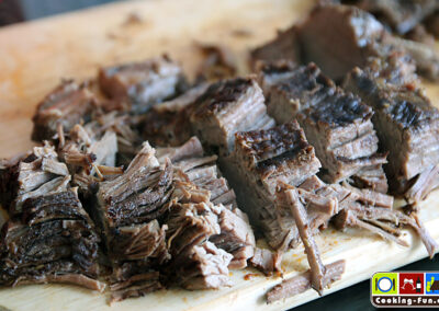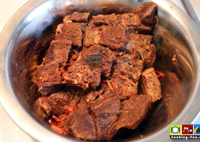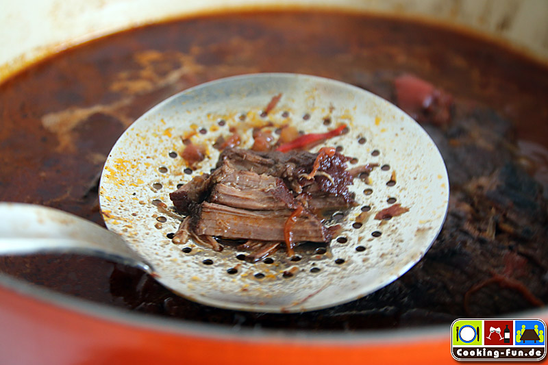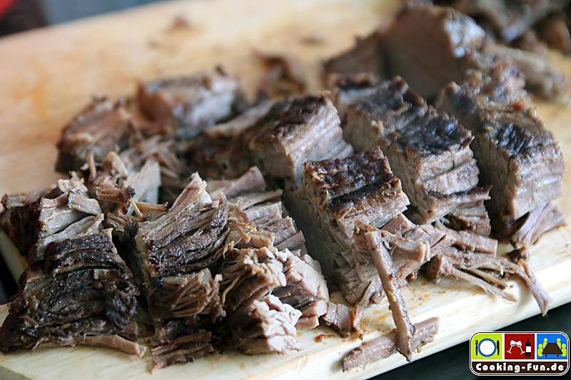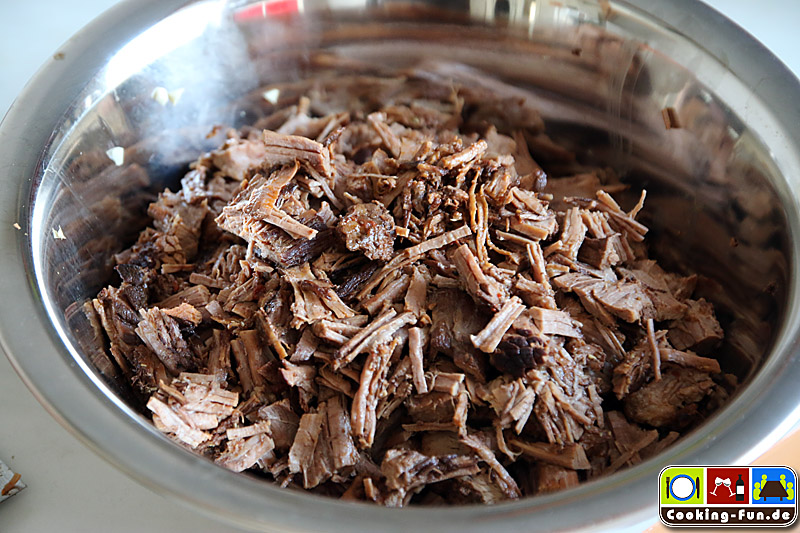 Damit ist das Fleisch fertig und wäre auch für die diversesten anderen Weiterverwendungsformen (dann nochmals abschmecken) mit oder ohne Sud geeignet. Viel Spaß und guten Hunger!