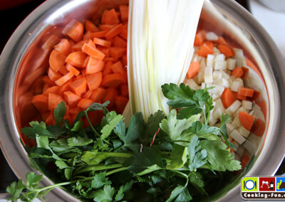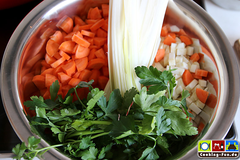 Ich liebe Suppengemüse. Also kommt nun das Gemüse dazu. Sellerie, Möhren schälen, in kleine, maximal bohnengroße Stücke schneiden. Den Lauch waschen und längst halbieren, von der Petersilie ein paar Blätter für die spätere Deko aufheben, den Rest im Ganzen einmal knicken und mit Bratengarn zu einem Bündel (lässt sich so später besser wieder entnehmen) binden. Lauch und Petersilie nehme ich nach dem Auskochen wieder heraus, da ich finde, dass sie sich beim späteren Teil-Pürieren nicht so gut machen und der Geschmack ist ausgekocht. Sellerie und Karottenwürfel bleiben jedoch als Einlage, die sind ja auch fester in ihrer Konsistenz. Bevor das Gemüse in den Fleischsud kommt und dort für ca. 30 bis 45 Minuten köchelt, aber vorher den Lorbeer entfernen, jetzt findet man ihn noch.