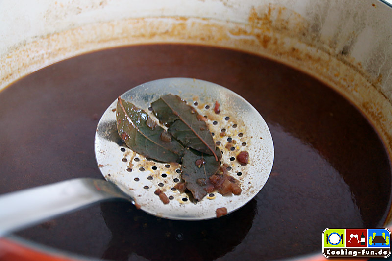 Das gezupfte Fleisch beiseitelegen. Der Sud dient als Basis für das weitere Vorgehen.