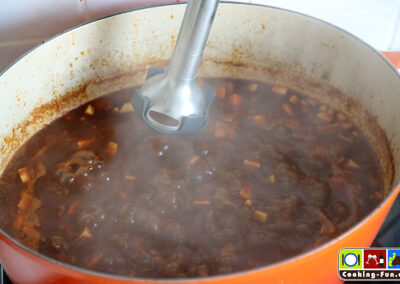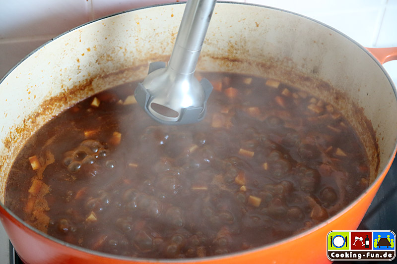 Denn zunächst kommt die Konsistenzfrage. Lauch und Petersilie rausfischen und entsorgen. Ich hab das Chili gern etwas dickflüssiger und gehe dafür mit dem Pürierstab in den Sud. Püriere aber nicht alles, da ich auch etwas Gemüse noch als Einlage behalten will. Also nur einen kleinen Teil pürieren, so kann ich die Konsistenz entsprechend dickflüssiger gestalten.