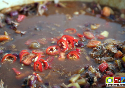 Zum Finale das Fleisch zugeben, abschmecken mit Salz, Pfeffer, Chili, Zucker, Essig, Oregano, Kreuzkümmel, Knoblauch oder was Euch sonst noch fehlt. Manch einer gibt auch einen Schluck starken Kaffee dazu, ein Tribut an die Cowboys am Lagerfeuer, die wohl Ihren Rest-Kaffee im Bohnengericht verwerteten, das ist aber nicht meins. Einen pfiffigen Kniff allerdings bringt fein geriebene Bitterschokolade oder etwas dunkles Kakaopulver.