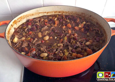 Schau mal auf die Fotos, der große Bräter war ordentlich voll. Also 8-10 hungrige Leute sollten satt werden. Insbesondere, wenn es noch Brot dazu gibt. Für eine Party kannst Du noch Reis dazu kochen, das streckt auch noch ordentlich. Ansonsten einfach etwas variieren, evtl. eine paar Bohnen oder auch beim Fleisch ein halbes KG mehr… ganz nach Gusto.