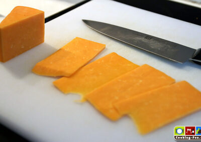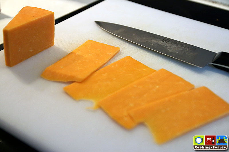 Beim Käse hätte ich gern Greyerzer (Gruyère) verwendet, der war aber an meiner Käsetheke gerade vergriffen, so dass ich auf den englischen Cheddar ausgewichen bin. Alternativ wäre Rezept-regionstreu wohl Emmentaler eine gute Wahl gewesen, aber seit ich die Cheddar Gorge besucht habe, hat mich dieser Käse einfach gefangen.
