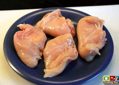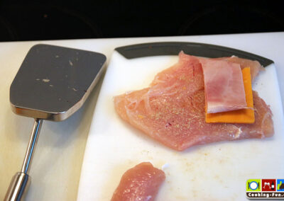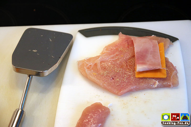 Das Prinzip ist einfach, man nimmt das Fleisch, schneidet (vorsichtig!) mit einem scharfen Messer eine Tasche hinein oder macht einen Schmetterlingsschnitt (aber nicht durchschneiden). Ggf. noch etwas plattieren. Innen etwas salzen und pfeffern (dabei Rücksicht auf die verwendete Füllung nehmen). Käse auf die Größe der Tasche zuschneiden, Schinken auf die doppelte Größe. Den Käse im Schinken einklappen und das Ganze mit der offenen Seite des Schinkens zur geschlossenen Seite des Fleischstücks auf der einen Seite des Fleisches platzieren. Wenn man das Fleisch nun zuklappt, läuft der Käse beim Schmelzen in das Fleisch hinein und nicht heraus (auf den Fotos hatten wir das noch nicht beherzigt und haben nachgebessert). Um das Paket in Form zu halten, kann man mit einem oder zwei Zahnstochern die Naht verschließen.