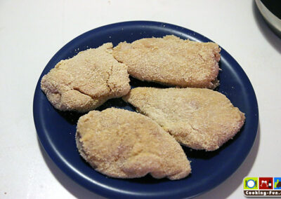 Für die zweite Station verwende ich eine flache Schale, in die ich die Eier aufschlage und mit ca. 5EL Milch, Salz, Pfeffer, frisch geriebenem Muskat und etwas Chili verquirle. So bekommt die Panade einen angenehmen Geschmack. Hier werden dann die bemehlten Fleischstücke mit der Eimischung benetzt.