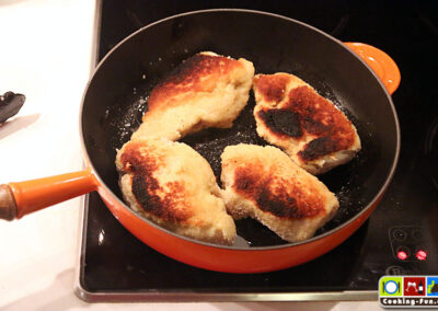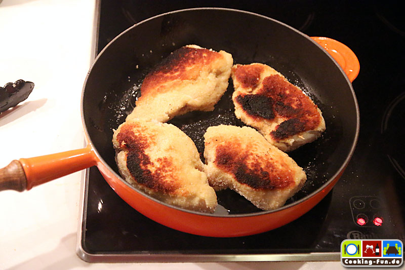 Die Fleischstücke nun bei mittlerer Hitze von allen Seiten je ca. vier Minuten anbraten. Achtung, nicht zu heiß braten, sonst wird die Panade schwarz. Dann für ca. 10 Minuten mit zum Gemüse aber im separaten Gefäß in den Ofen stellen und gar ziehen lassen. Wenn das Fleisch nicht zu dick ist, kann man es auch bei kleiner Hitze komplett in der Pfanne durchbraten, bei der relativ dicken Hühnerbrust war mir der Ofen die bessere Alternative.
