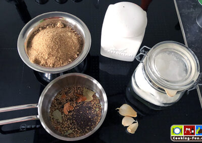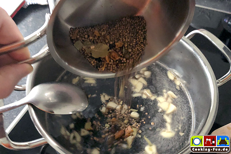 Einen kleinen Teil der gesamten Wassermenge erhitzen und Salze sowie Zucker darin auflösen. Nebenbei die Gewürze fettlos in einer Pfanne anrösten. Wenn die Küche ordentlich duftet, kommen sie mit ins warme Wasser. Nun auch das restliche Wasser kalt dazugeben. Die Lake muss richtig abkühlen, es soll kein Garprozess gestartet werden, wenn das Fleisch hineinkommt.