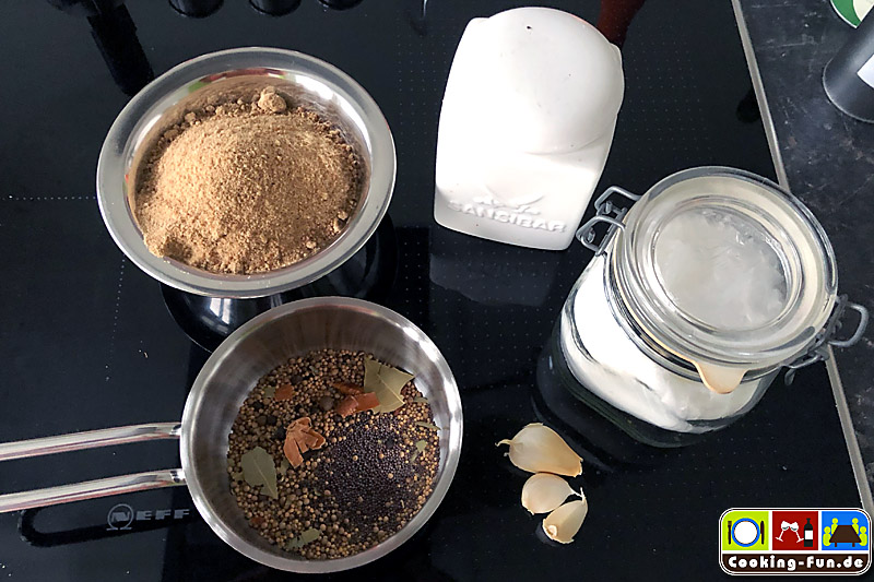 Das Einmachgewürz ist eine Mischung aus Senfkörnern, Koriander, Dillsaat, Pfeffer, Piment, Lorbeerblätter, Wacholderbeeren, Nelken, Ingwer und Chili. Kann man selber mixen oder auch fertig erwerben.