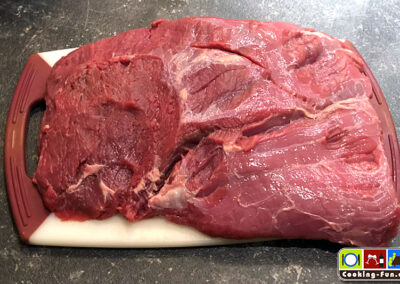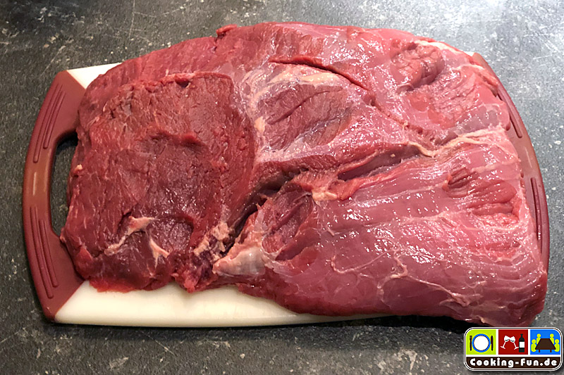 Wir brauchen ein langfaseriges Rinderfleisch, optimalerweise eine Rinderbrust (vorbestellen, ich verwende sie auch für mein Chili) oder von der Oberrippe oder notfalls ein Stück aus der Oberschale. Die Rinderbrust hat einen für diesen Zweck unschönen Fettdeckel. Fragt beim Fleischer, ob Ihr sie ohne diesen bekommen könnt.