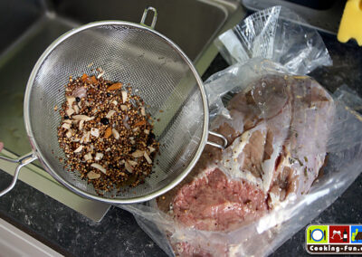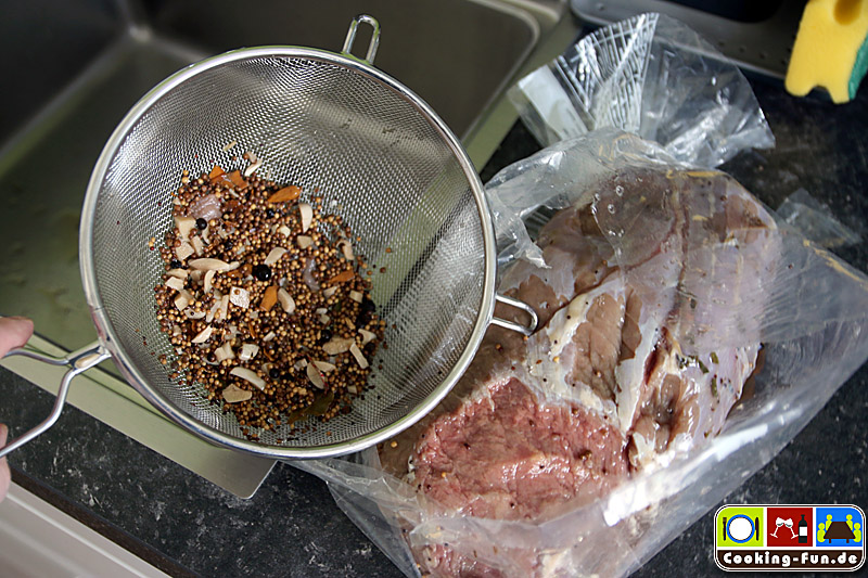 Nach zehn Tagen (bei mir nach 14 Tagen, vorher hatte ich keine Zeit) die Lake durch ein Sieb abgießen, das Fleisch gründlich mit kaltem Wasser abspülen und beiseitelegen. Es ist außen grau geworden, innen sieht man schon ein rotes Schimmern.