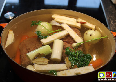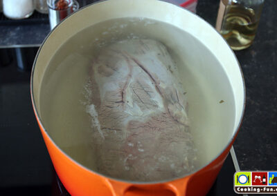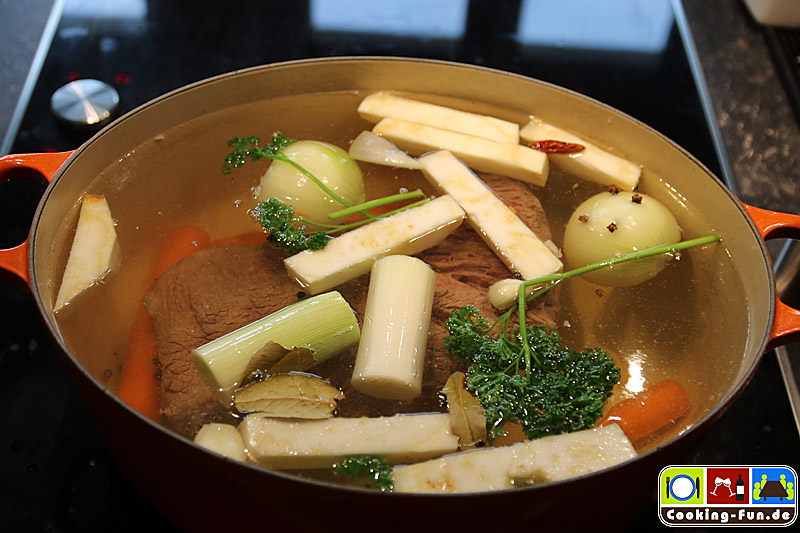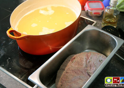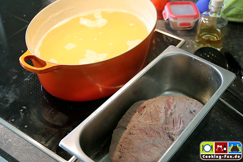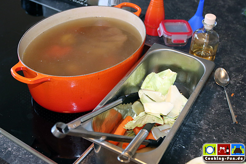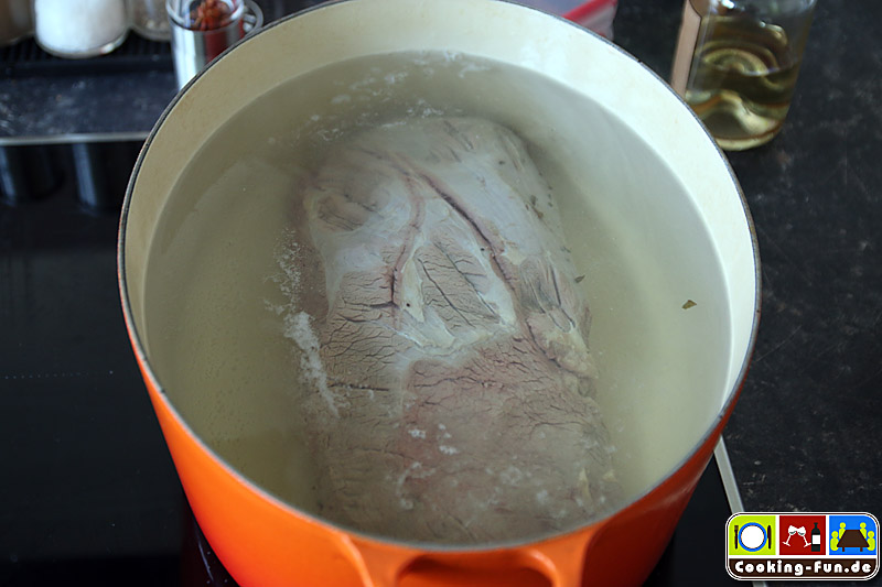 Nun wird das Fleisch gekocht. Das dauert im Summe ca. 3,5 Stunden, nur zur Planung vorweg.