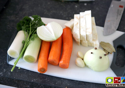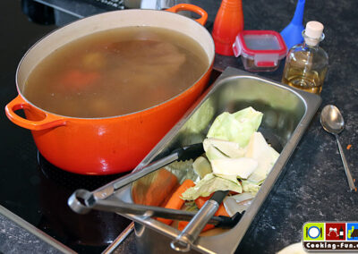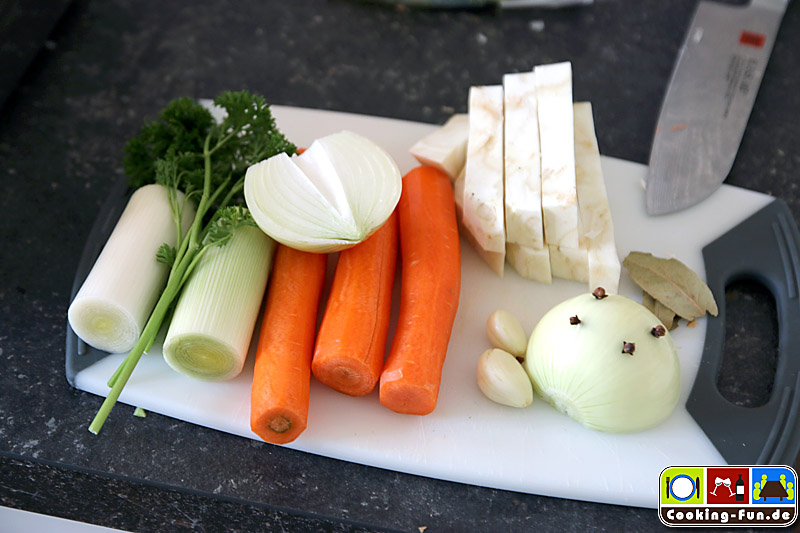 Das Suppengrün aus dem Topf nehmen, damit es später nicht versehentlich mit serviert wird (es ist durchgekocht).