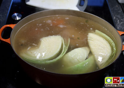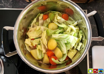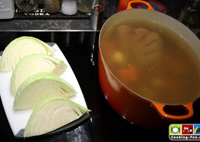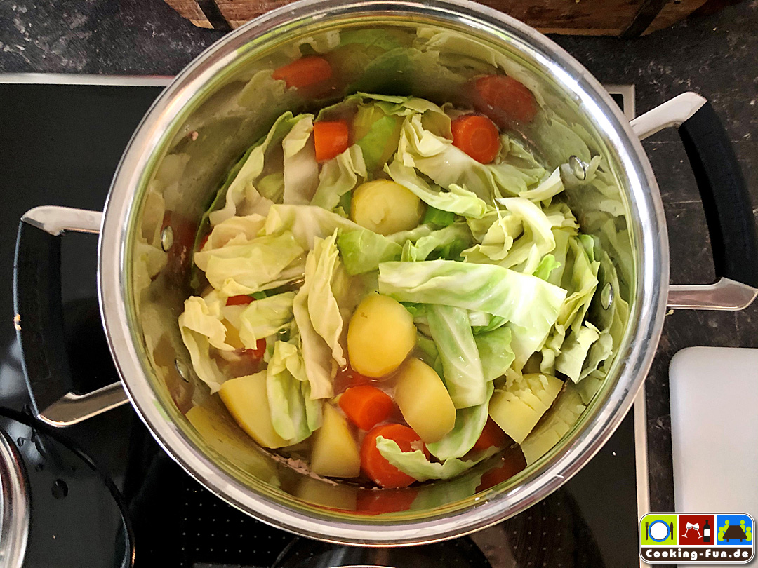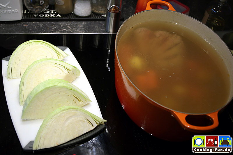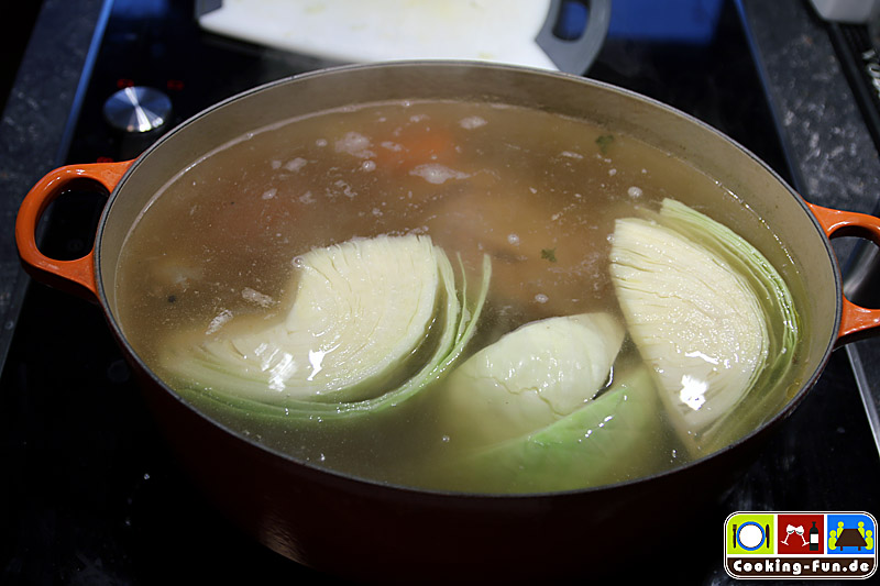Nebenbei den Kohl putzen, vom Strunk befreien und in 8 Teile schneiden. Mit ins Wasser. Nach weiteren 5-10 Minuten sollte alles fertig und gar sein (Das Fleisch soll weich und biegsam sein).