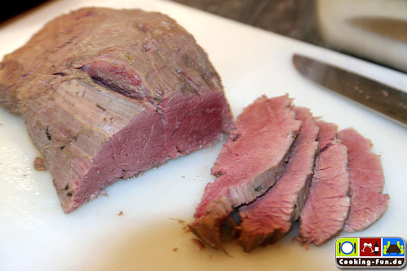 Gemüse herausnehmen, Kohl ggf. kleinschneiden (oder, Idee fürs nächste Mal: noch in etwas Butter anschwitzen) und auf die vorgewärmten Teller verteilen. Dann das Fleisch herausheben und quer zur Faser (das ist wichtig!) in dünnen Scheiben aufschneiden.