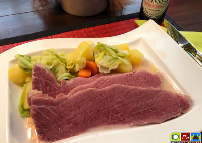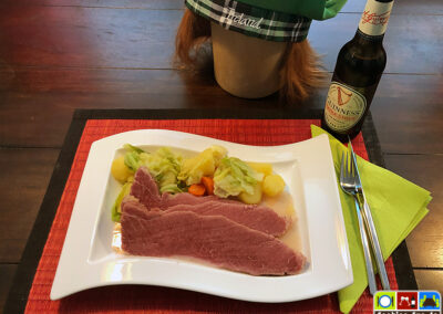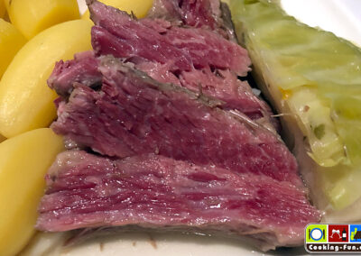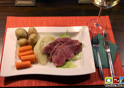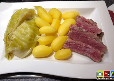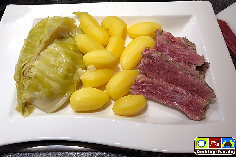 Als ich mir mal angeschaut habe, was da überhaupt gefeiert wird, bin ich auf dieses Gericht gestoßen, das bei den Iren als Festtagsessen gilt, besonders zum St. Patrick’s Day. Bei allen Iren? Eher bei den amerikanischen Immigranten, die aus Kostengründen eher günstigeres Fleisch, dazu zählte die Rinderbrust, am Feiertag verwenden mussten. In Irland selbst findet sich dieses „traditionelle“ Essen eher seltener. Also schon ein traditionelles Essen, aber etwas weniger irisch als angenommen. PS: In Neufundland gibt es dieses Essen auch als Sonntagsessen, dort ist es als Jiggs Dinner bezeichnet – nach der Hauptfigur in einem Comic (Bringing Up Father), deren Leibspeise dies ist.