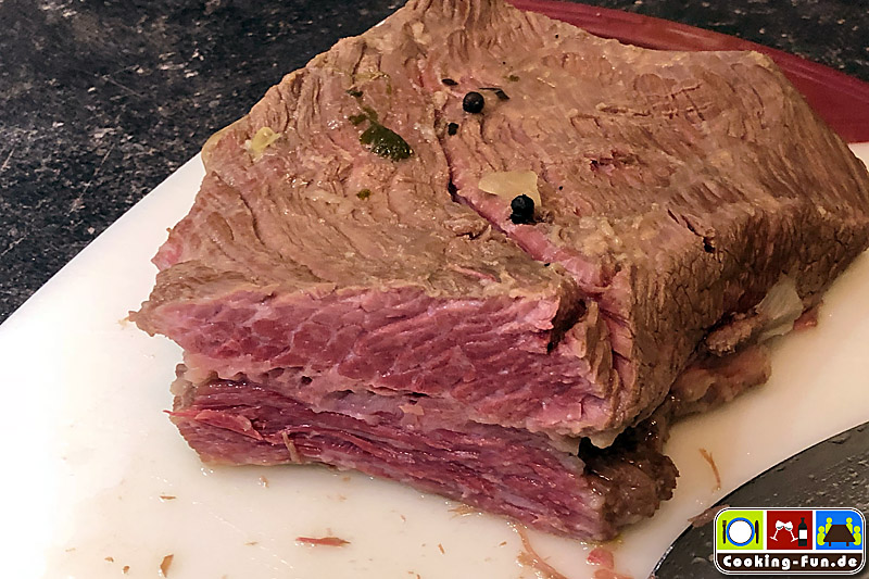 PS: Hier wird das Fleisch zu Corned Beef weiterverarbeitet. Packt man es jetzt aber mit einem passenden Rub bei 100-110°C in einen Smoker, so wird daraus Pastrami. Ziel-Kerntemperatur 68°C. (Notiz für mich selbst: ich brauche einen Smoker!).