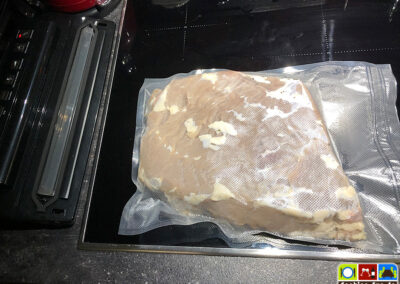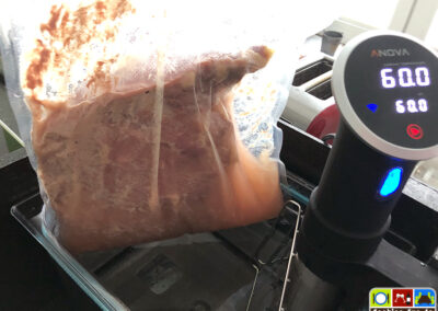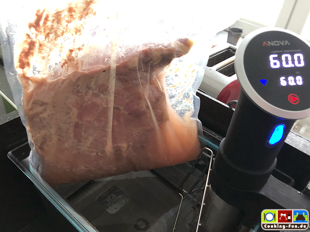 Das Fleisch dann einmal trockentupfen und ab in den Vakuumbeutel. Im Wasserbad gart es dann bei 60°C für 48 Stunden (2 Tage). Ich habe wie so oft weit gefächerte Angaben im Web gefunden und habe mich für einen Mittelweg entschieden. Das Ergebnis gefällt mir. Das Fleisch ist zart, hat aber auch noch Halt und zerfällt nicht. Wie sind Eure SV-Eckdaten?