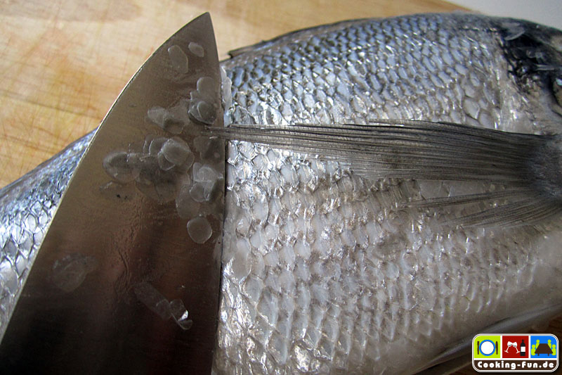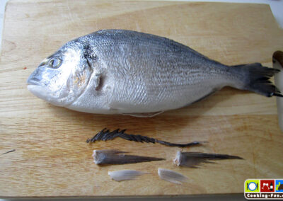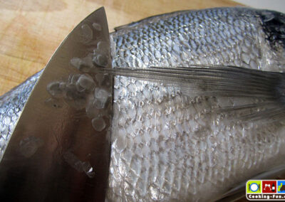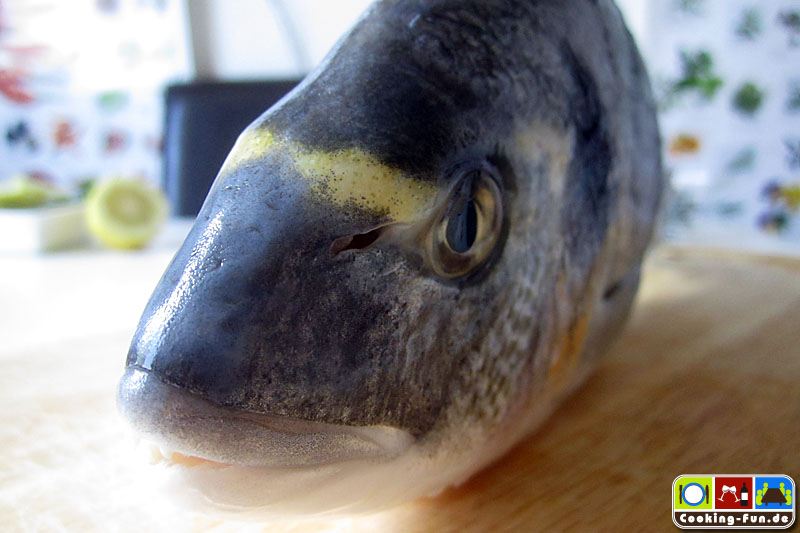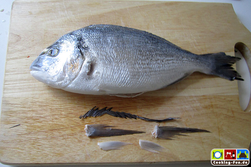 Zuerst den Fisch von letzten Schuppen befreien (manch einer möchte die Haut mitessen), dazu gegen den Strich mit einem Messerrücken über die Haut streichen. Die Dorade innen und außen waschen und trockentupfen. Nun noch die Seiten- und Bauch-Flossen mit einer stabilen Schere abschneiden, denn sie würden sonst nur verbrennen.