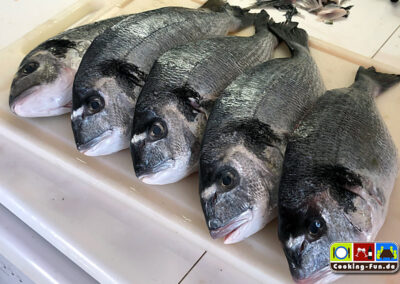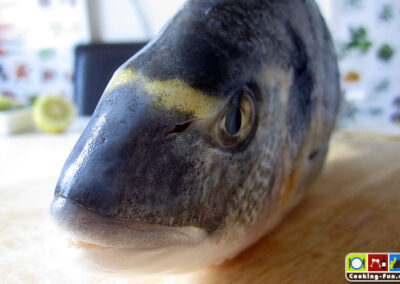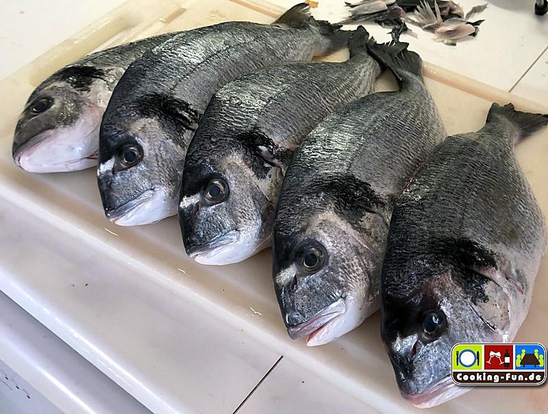 Die Goldbrasse (auch bekannt als Dorade) verdankt ihren Namen dem goldenen Band auf ihrer Stirn. Sie ist beheimatet im Mittelmeer. Aber das wichtigste ist: sie schmeckt echt lecker und ist dankbar in der Verarbeitung.
