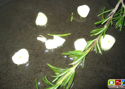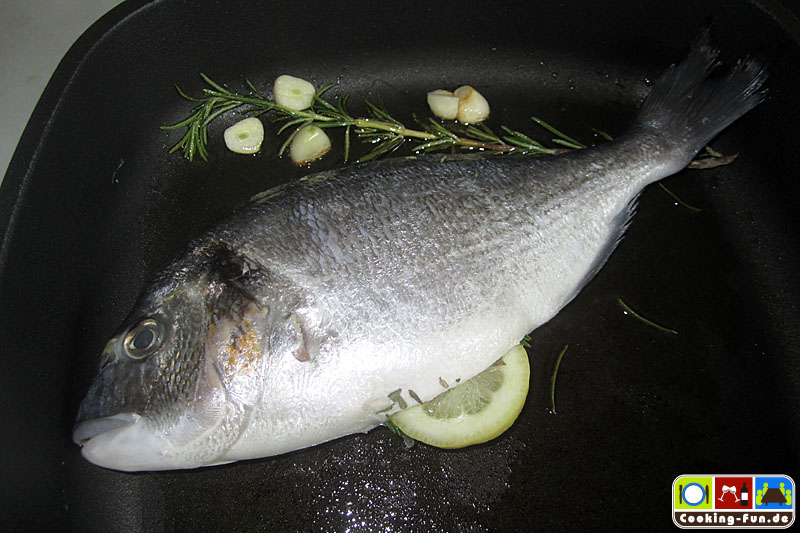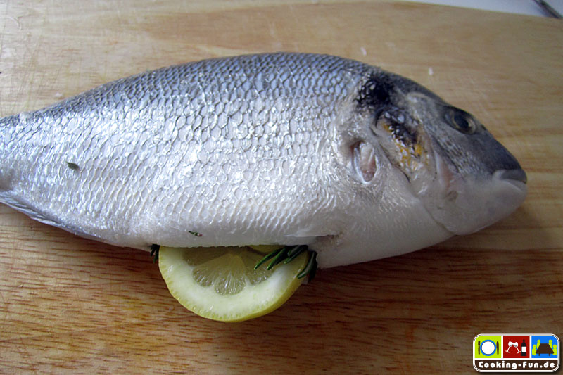 Für die Aromatisierung eine grob zerquetschte Knoblauchzehe, je einen Zweig Rosmarin und Thymian sowie etwas Bohnenkraut und 1-2 Scheiben Biozitrone in die Bauchhöhle des Fisches geben. Den Fisch noch ordentlich mit Salz einreiben, ca. einen gestrichenen Teelöffel je Seite.