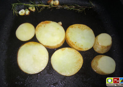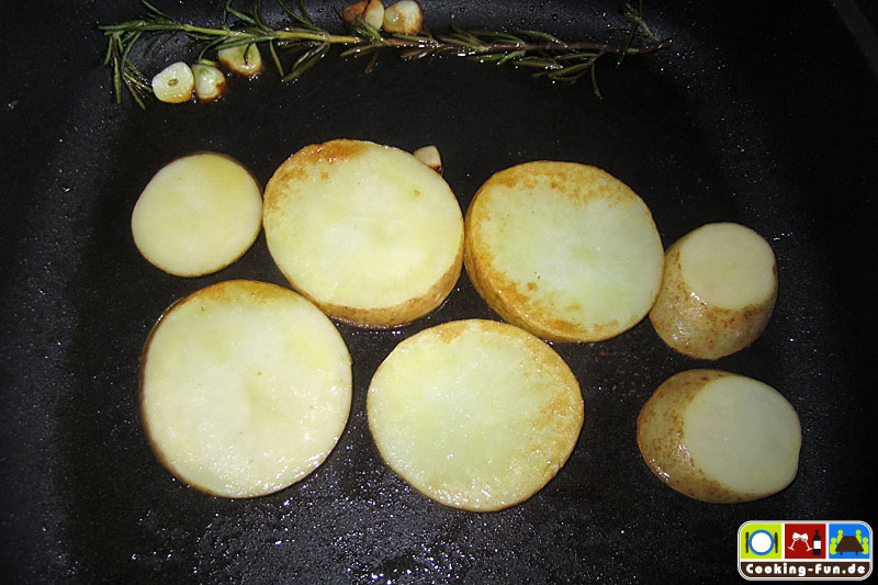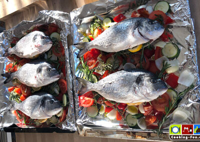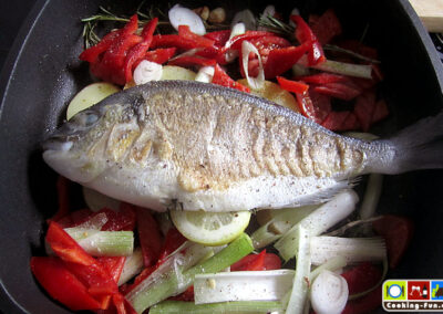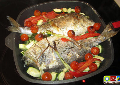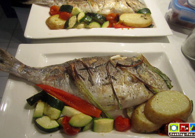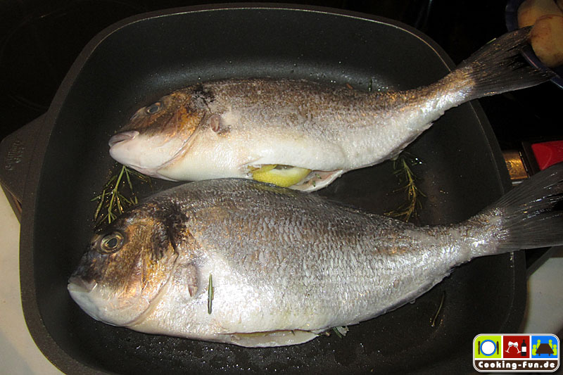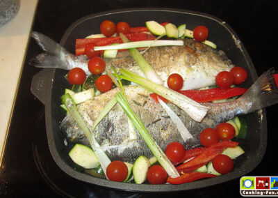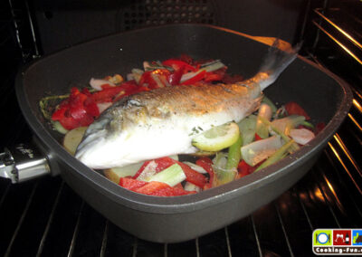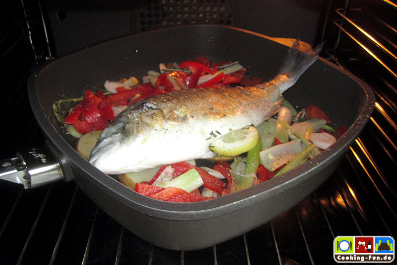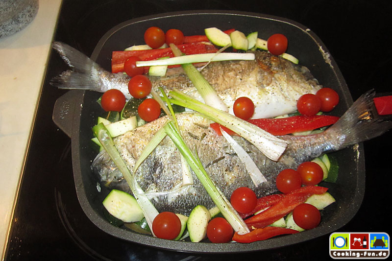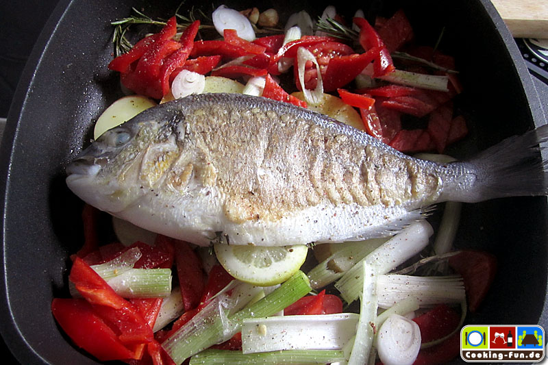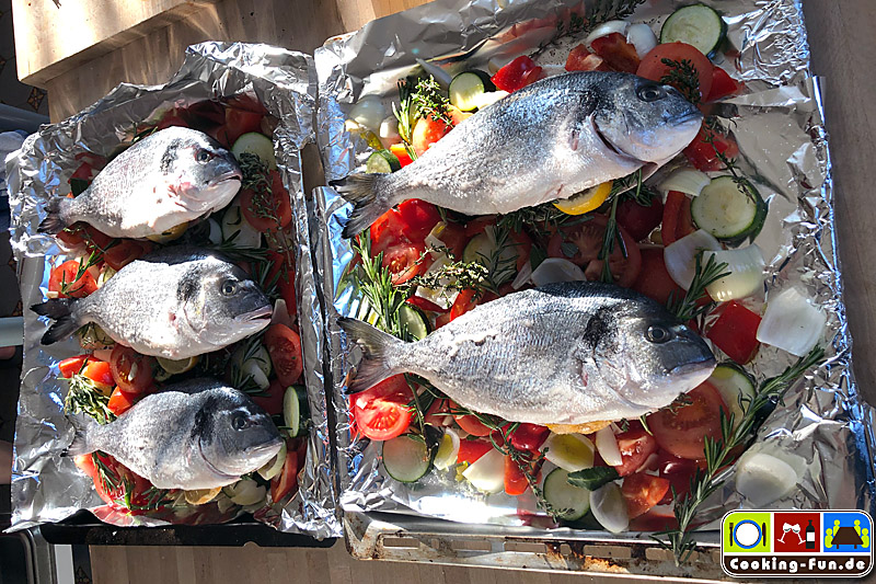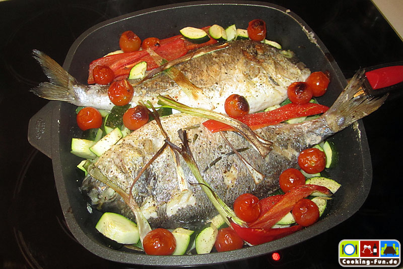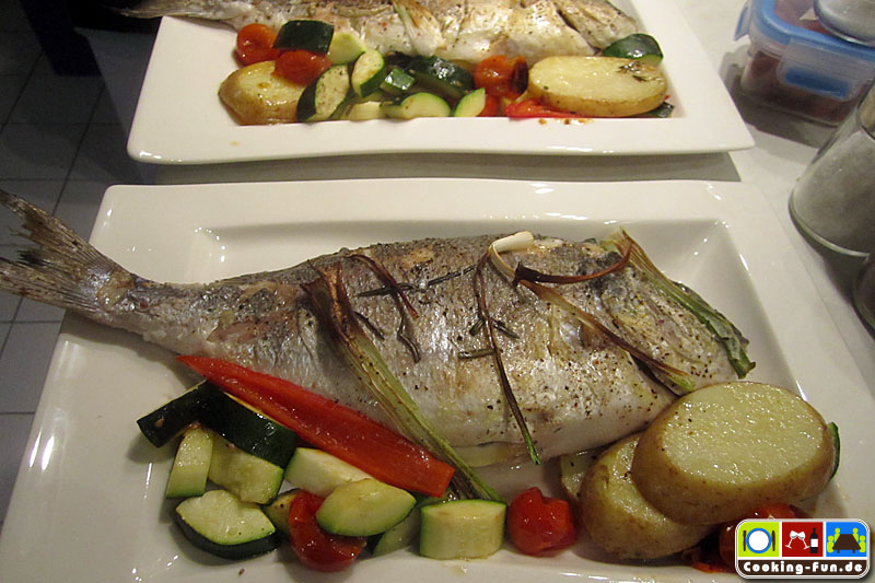 Etwas Olivenöl in eine schwere Pfanne oder Bräter (sollte auch Ofentauglich sein) geben und das Öl mit Knoblauch und einem Zweig Rosmarin aromatisieren, dann die Fische jeweils für eine Minute auf jeder Seite scharf anbraten. Die Fische kurz aus der Pfanne heben und die Kartoffeln darin auf einer Seite eine Minute anbraten, Pfanne von der Flamme nehmen, Kartoffelscheiben wenden und so ausbreiten, dass dann die Fische darauf gelegt werden können (die Fische sollen nicht direkt mit der heißen Pfanne in Kontakt kommen). Wenn die Fische liegen, wird das kleingeschnittene Gemüse rundum angelegt, Salz und Pfeffer darüber und alles zusammen wandert für 20-25 Minuten in den Ofen.