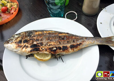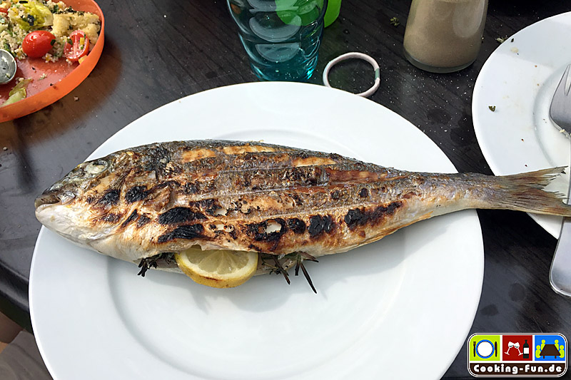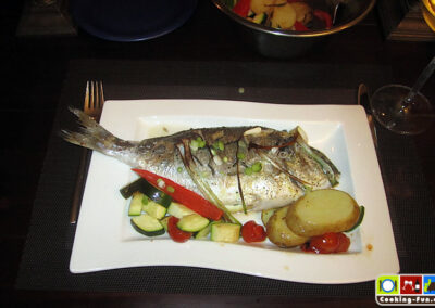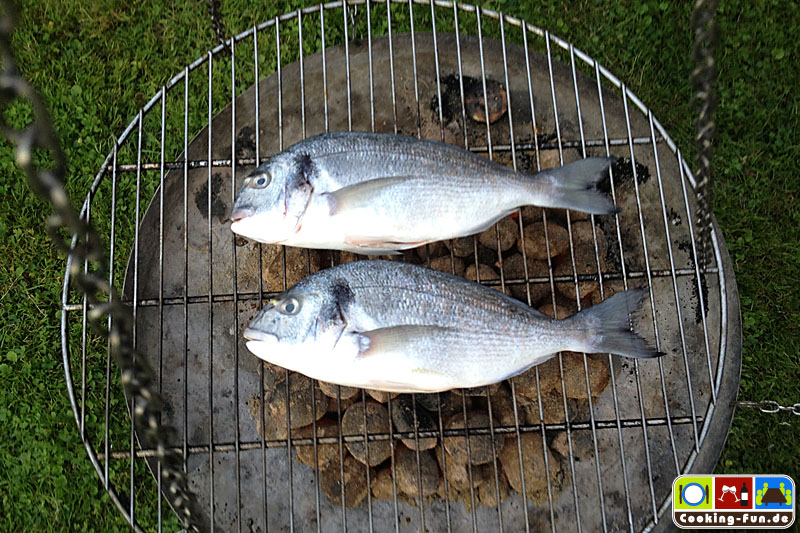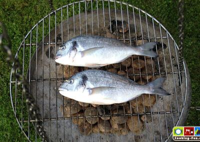 Tipp für einen Grillabend: Dorade wie beschrieben vorbereiten und leicht mit Öl abtupfen, dann einfach je Seite ca. 7 Minuten auf den Grill, hoch genug, dass die Fische nicht verbrennen. Das Kräuteraroma zieht dabei allerdings ob der kurzen Zeit nicht so deutlich durch wie in Ofen.