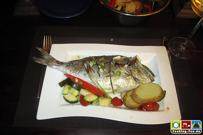 Fische und Gemüse auf die Teller verteilen, Frühlingszwiebel darüber streuen, noch 1-2 Zitronenscheiben anlegen und sofort servieren.
