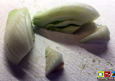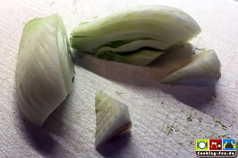 Radieschen und Fenchel putzen und waschen, den Fenchel vierteln und den Strunk mit einem „Dreiecksschnitt“ (gibt bestimmt einen Fachbegriff dafür – vgl. Foto) entfernen.